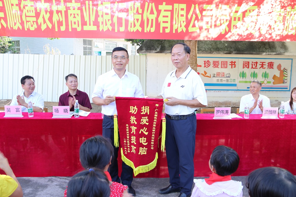 廣東順德農(nóng)村商業(yè)銀行股份有限公司梁棧祥經(jīng)理向羅平小學(xué)贈送“綠色愛心電腦教室”牌匾,羅平小學(xué)陳永新校長接收牌匾。