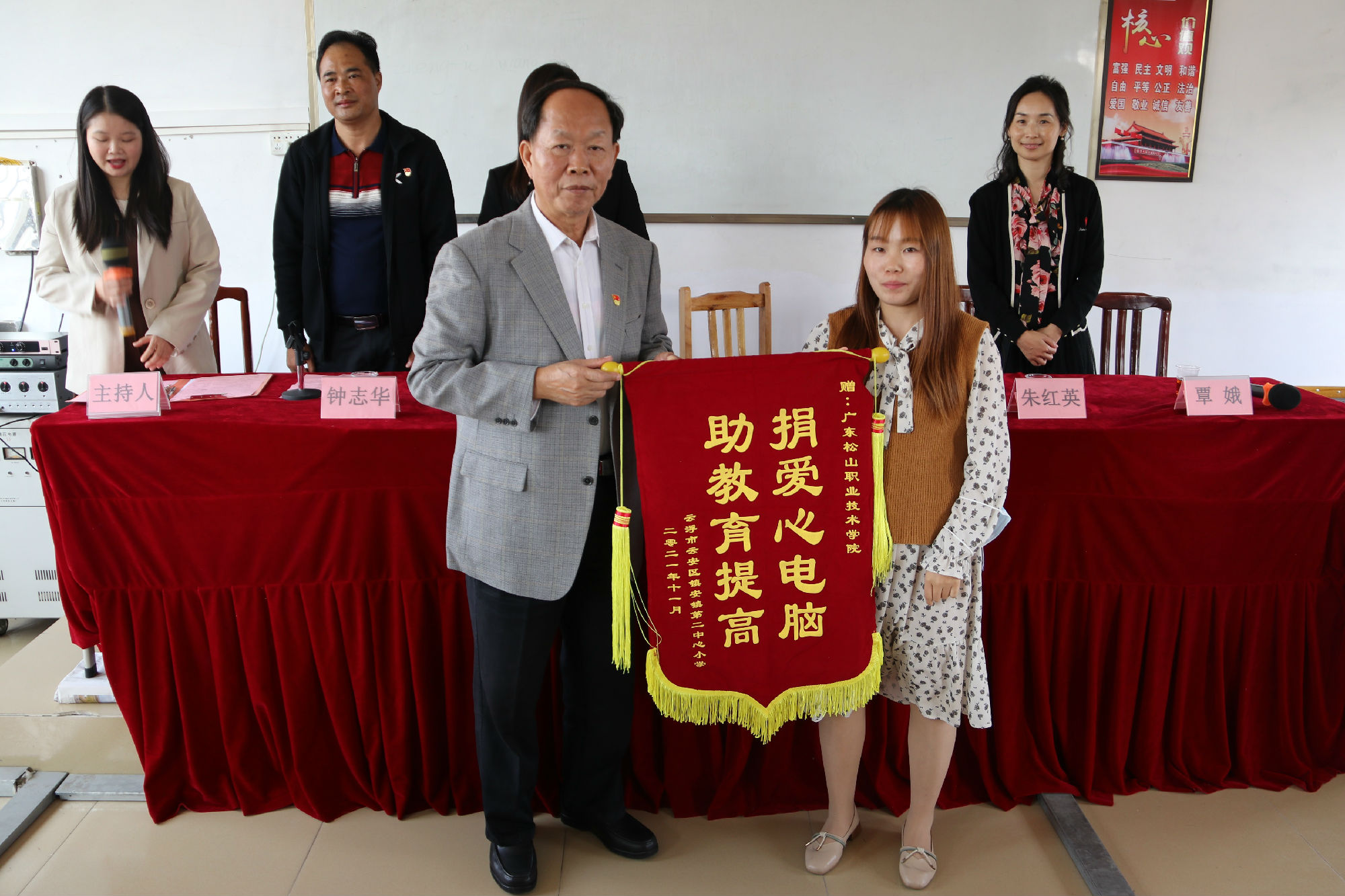 廣東省教育基金會鄭熾欽秘書長向廣東松山職業(yè)技術(shù)學院贈送錦旗,深圳八方園通慈善項目負責人覃娥代接收錦旗