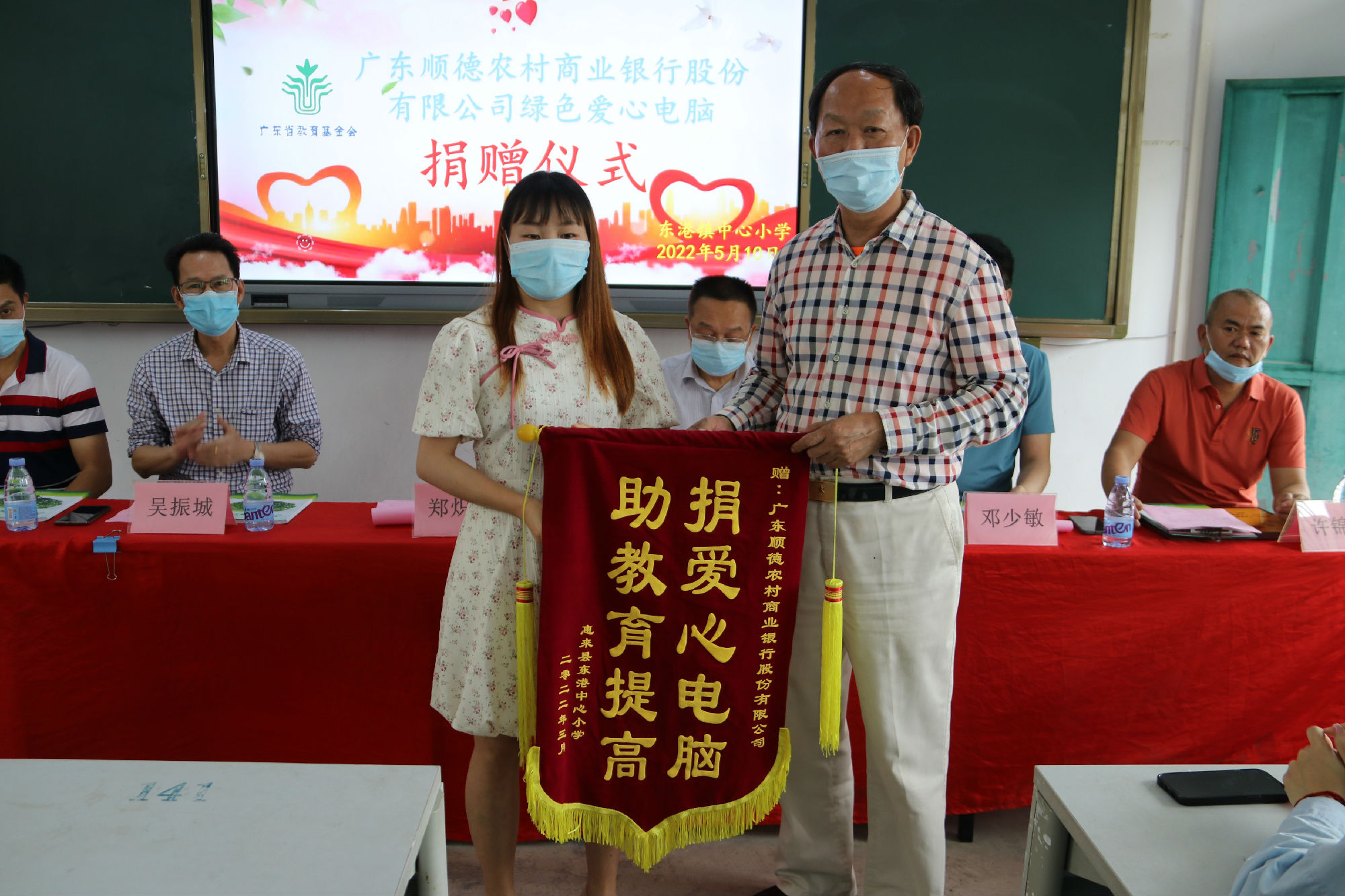 廣東省教育基金會鄭熾欽秘書長向廣東順德農(nóng)村商業(yè)銀行股份有限公司贈送錦旗,覃娥代廣東順德農(nóng)村商業(yè)銀行股份有限公司接收錦旗
