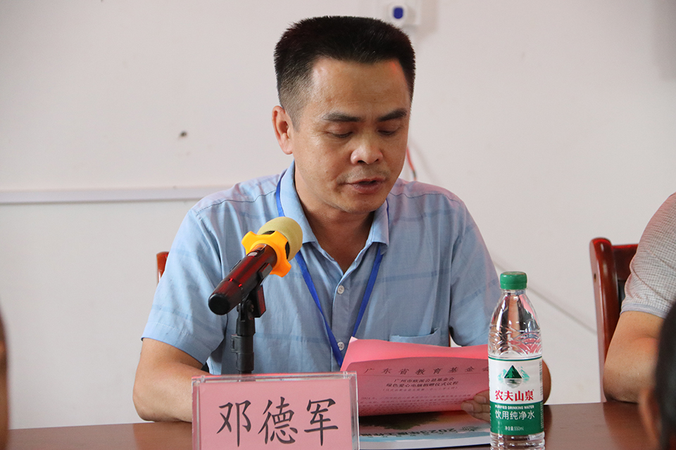 鄧德軍副校長代表全體師生向出席捐贈(zèng)活動(dòng)的各位領(lǐng)導(dǎo)和嘉賓表示由衷的感謝和崇高的敬意!他說,由于學(xué)校地處河源、梅州、汕尾交界的偏遠(yuǎn)山區(qū),地處偏遠(yuǎn),學(xué)校的辦學(xué)條件相對落后,學(xué)校還沒有電腦室。廣州市歐派公益基金會(huì)本次捐贈(zèng)的電腦,給予學(xué)校的是物質(zhì)上的支持以及精神上的鼓勵(lì)。鄧副校長表示,今后,學(xué)校將教育學(xué)生,以此為契機(jī),用書中的知識(shí)充實(shí)頭腦,用電腦設(shè)備學(xué)好信息技術(shù),用智慧改變貧窮、改變命運(yùn),造福社會(huì),長大后為振興家鄉(xiāng)、振興中華貢獻(xiàn)自己的力量。