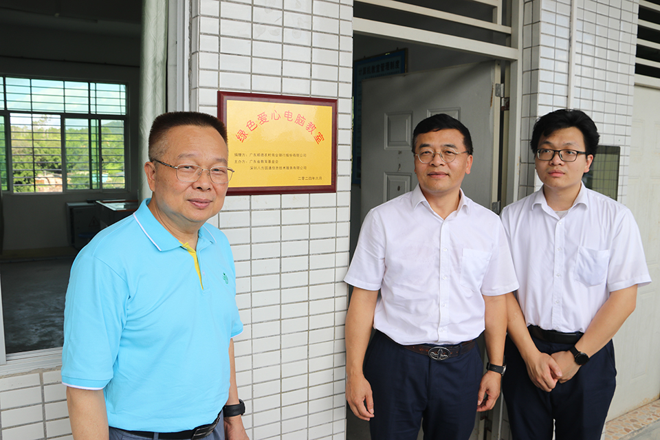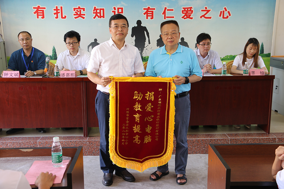 羅偉濤副總經(jīng)理向紫金縣九和鎮(zhèn)中心小學(xué)贈(zèng)送“綠色愛(ài)心電腦教室”牌匾