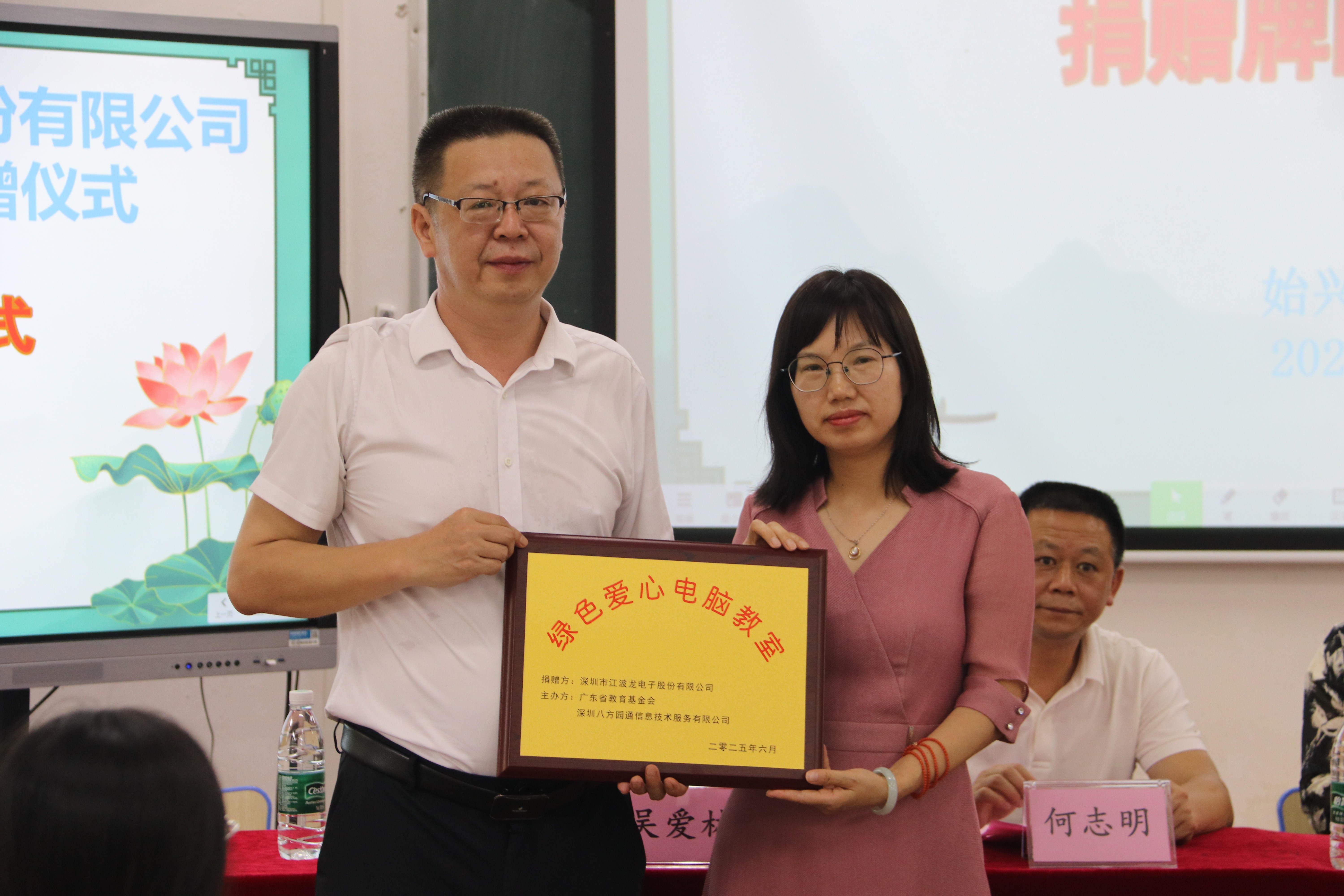 肖小霞女士向始興縣馬市中學(xué)贈(zèng)送“綠色愛心電腦教室”牌匾