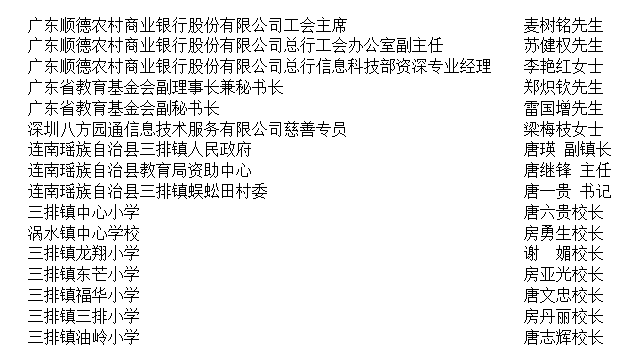 捐贈儀式在三排鎮(zhèn)龍翔小學操場舉行,出席捐贈儀式的領導和嘉賓: