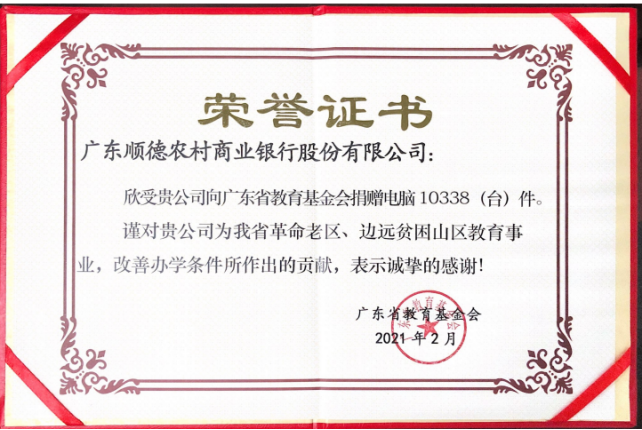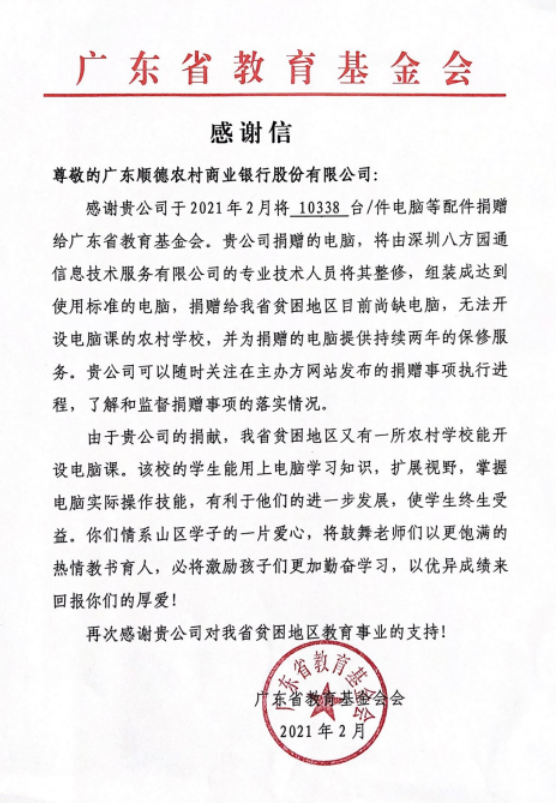 廣東順德農村商業(yè)銀行股份有限公司踐行公益履行職責,用行動踐行承諾,熱心為學校服務,積極履行社會責任,愛心落地 心暖學童,積極參與和推動兼有環(huán)保和扶貧雙重內涵的“綠色愛心電腦捐贈活動 ”,及時捐獻閑置或淘汰的電腦,積累了良好的社會效應,有力彰顯了企業(yè)的良好社會形象。